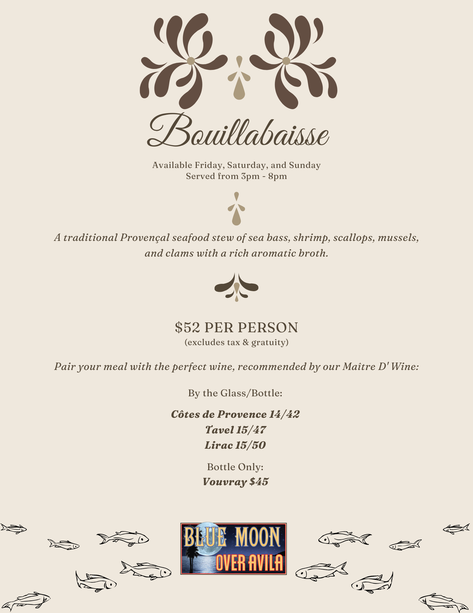 Heartwarming and filling, bouillabaisse is a staple of the French diet, and now available at Blue Moon. Watch the sun set over Avila Beach as you enjoy this traditional Provençal meal with a delightful glass of wine.